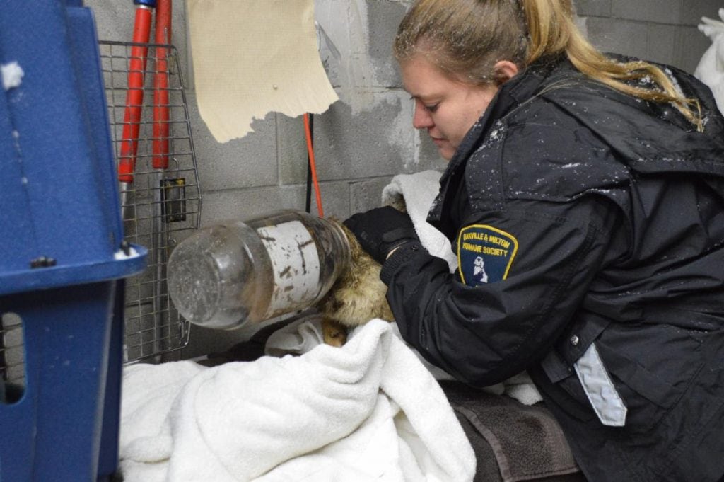 The OMHS Animal Protective Services (APS) team sprung into action on the evening of November 11th, during a snowstorm, to successfully rescue a female coyote that had a plastic container completely covering its head. The animal was found near Bronte Road, north of Speers Road and had been struggling with this unfortunate situation for nearly a week.